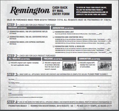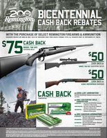 Remington continues to celebrate 200 years with more bicentennial rebates. We are only weeks away from getting our FFL so unfortunately we cannot help you with any firearm purchases but we do have a good amount of Ammo In Stock and ready to ship. Please be sure to take full advantage of our flat rate shipping of only, $14.74 for any amount of ammo!